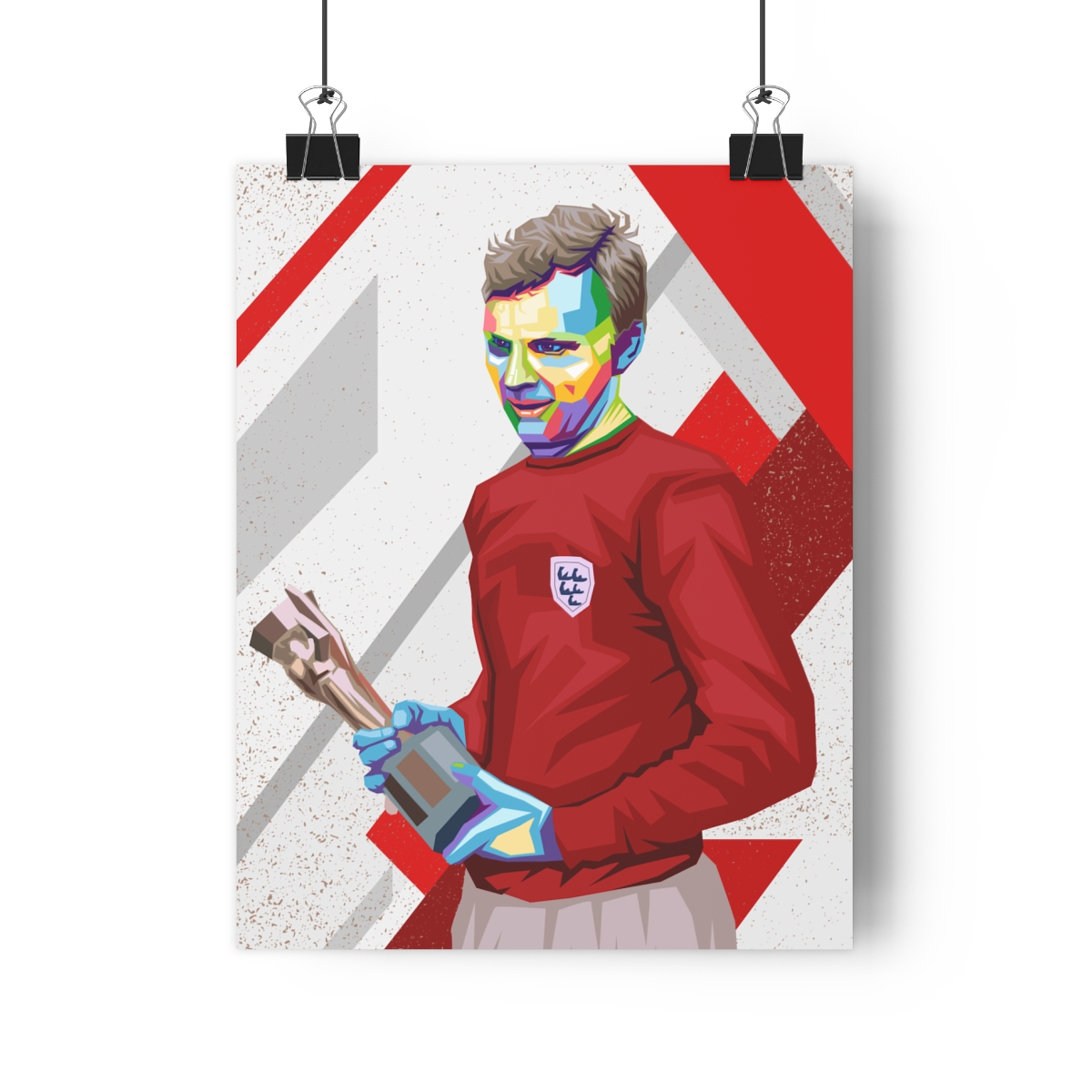 Immerse yourself in the legacy of Bobby Moore with our iconic poster. This artwork pays homage to Moore’s elegant style, impeccable technique, and exceptional leadership on the pitch. As the captain of England’s World Cup-winning team in 1966, Moore left an indelible mark on football history. Hang this poster proudly in your space to be inspired by Moore’s grace, composure, and enduring legacy with every glance. Perfect for fans of football history and admirers of individual greatness, this poster is a timeless tribute to one of the sport’s most iconic and beloved figures.