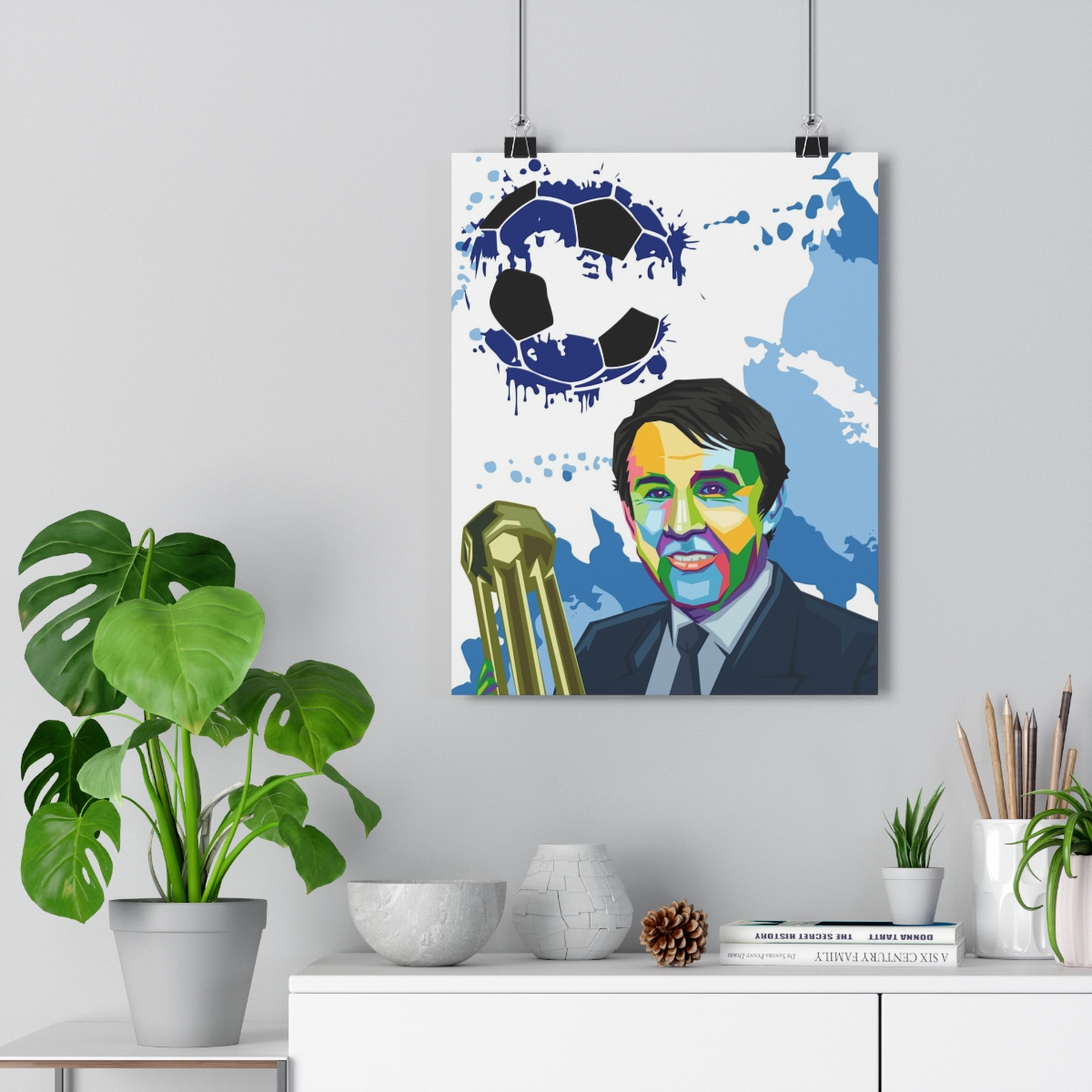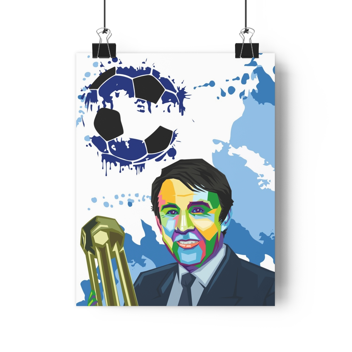 In this iconic artwork, you have an image of Howard Kendall holding the First Division trophy after Everton won it in the 1980s.
