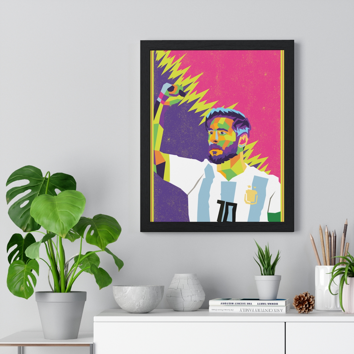 Commemorate the footballing icon Lionel Messi with our “Lionel Messi: The Footballing Phenomenon – Iconic Framed Artwork.” This piece celebrates Messi’s dribbling mastery, vision, and goal-scoring prowess, showcasing his enduring legacy in Argentine and world football.
