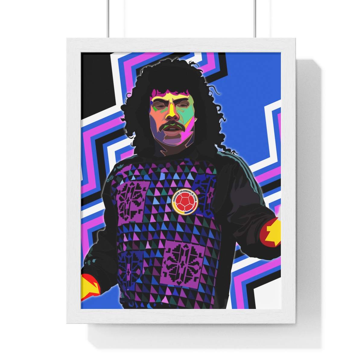 Pay tribute to the legendary goalkeeper Rene Higuita with our “Rene Higuita: The Scorpion King – Iconic Framed Artwork.” This piece celebrates Higuita’s eccentricity, agility, and innovative ‘scorpion kick’ save, showcasing his enduring legacy in football history.